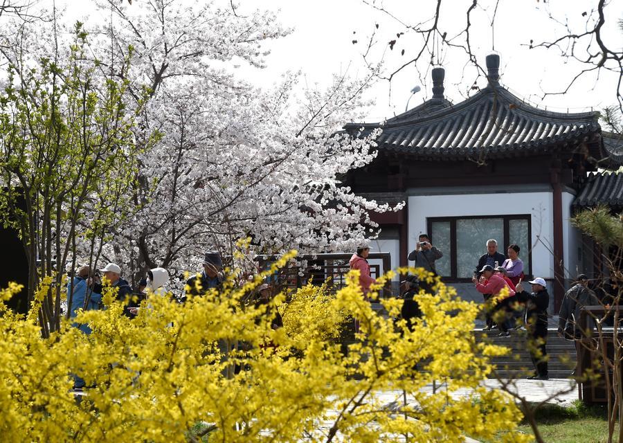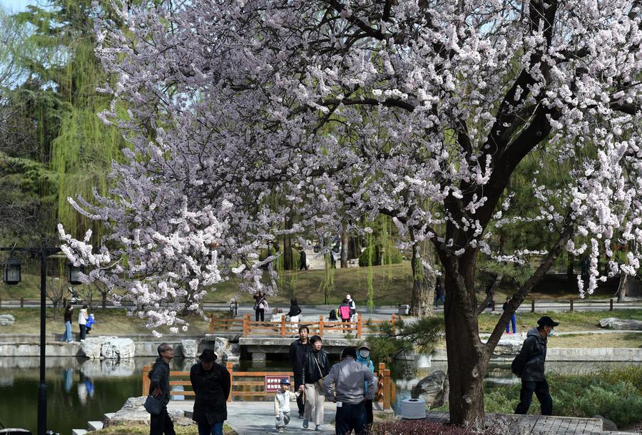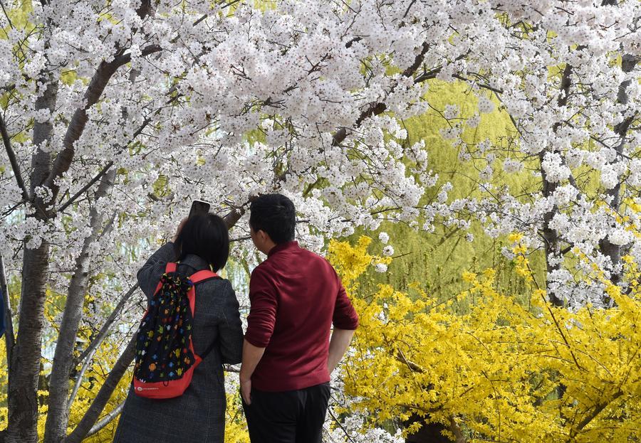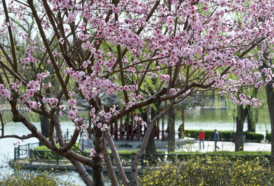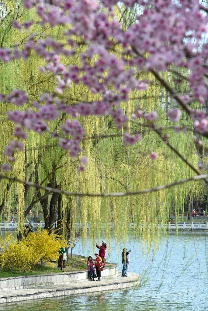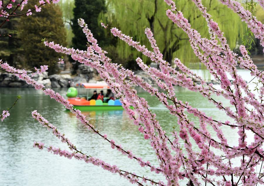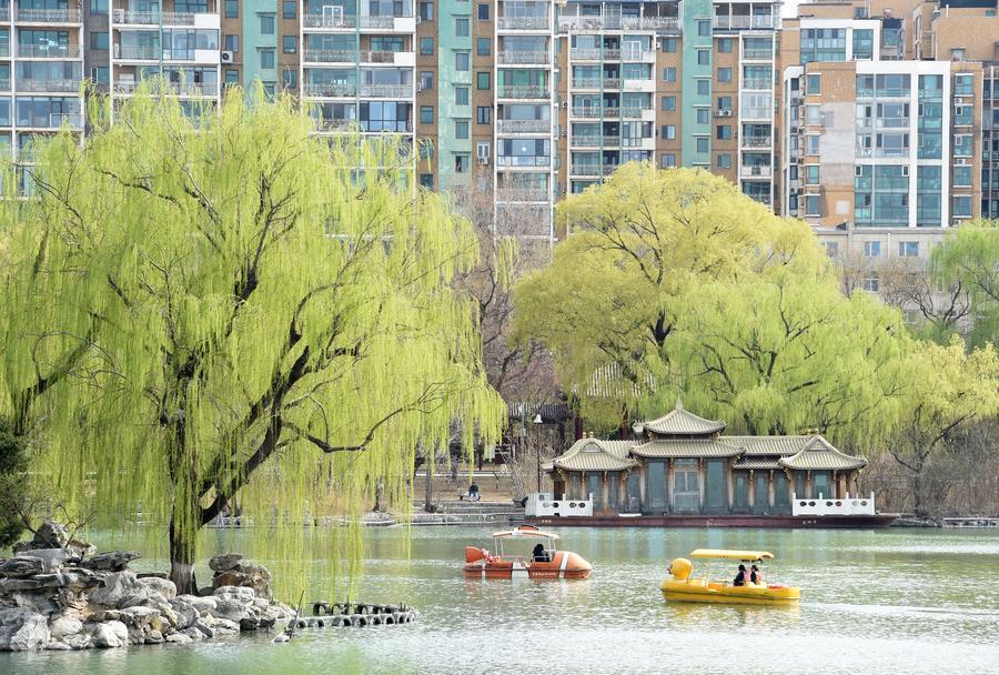 【新華社北京3月29日】春を迎えた中国北京市。市内の大型公園では柳が芽吹き、さまざまな花が咲き乱れ、春の陽気に誘われた多くの人が訪れている。