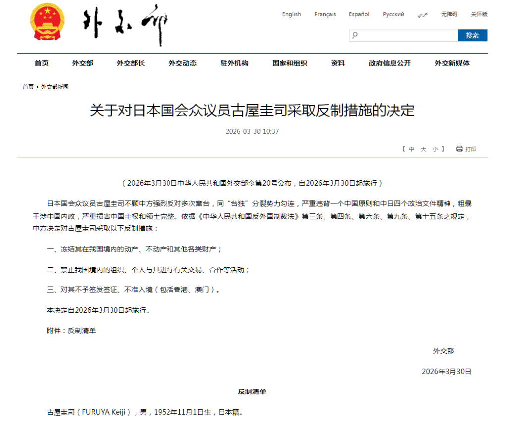 【新華社北京3月30日】中国外交部は30日、日本自民党の古屋圭司衆議院議員に対し、反外国制裁法に基づく制裁を科すと発表した。中国の強い反対を顧みず幾度も中国台湾地区を訪問して、「台湾独立」分裂勢力と結託し、「一つの中国」原則と中日間の四つの政治文書の精神に大きく背き、中国の内政に乱暴に干渉し、中国の主権と領土の一体性を甚だしく損なったとした。