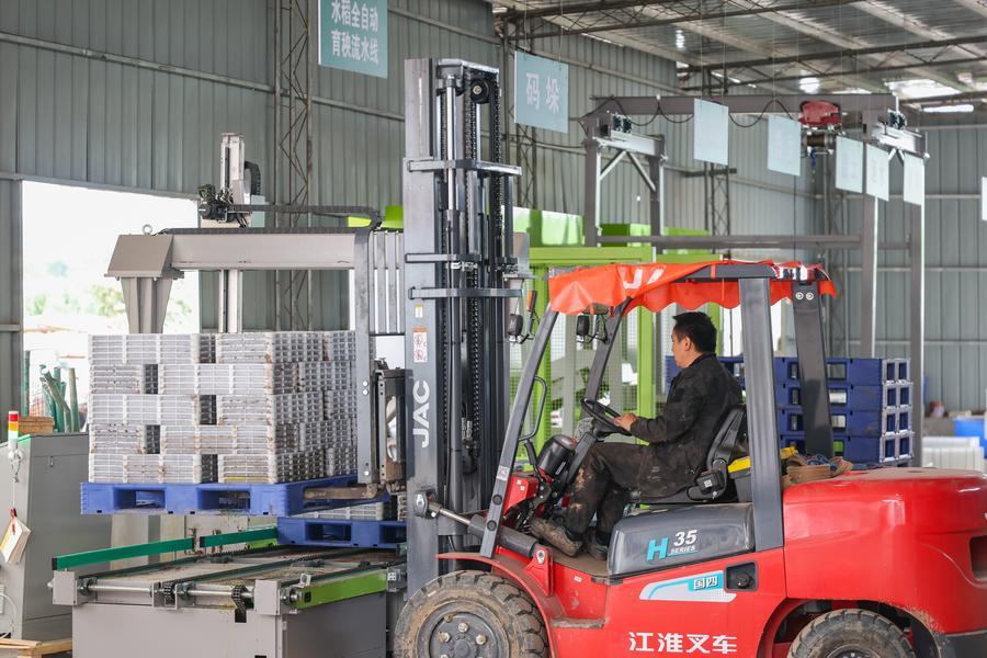 27日、重慶市永川区の二郎壩村で、ロボットが積み上げた育苗パレットを全自動育苗ラインから暗室の発芽促進室へ運ぶ地元住民。(重慶=新華社記者/黄偉)