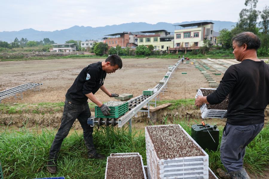 27日、重慶市永川区の二郎壩村で、発芽促進後の育苗パレットを搬送ラインに載せ育苗田へ運ぶ村民。(重慶=新華社記者/黄偉)