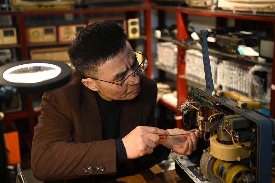 25日、古い映写機のメンテナンスをする張賽祥さん。(樟樹=新華社配信/周亮)