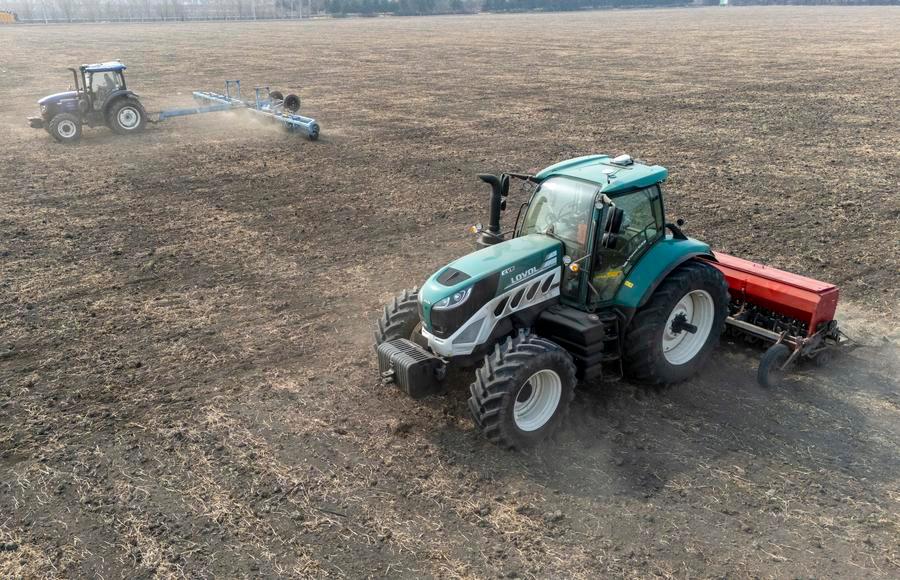 【新華社ハルビン3月31日】中国黒竜江省の一部の開墾地区で、小麦の種まきが進められている。同省ハルビン市にある農業企業、北大荒農墾集団傘下の閆家崗(えんかこう)農場では黒土の上を農機が行き来し、正確に作業しており、403ムー(約27ヘクタール)の種まきが間もなく完了する。