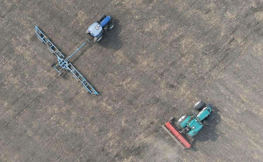25日、閆家崗農場で行われた小麦の種まき。(ドローンから、ハルビン=新華社記者/王松)