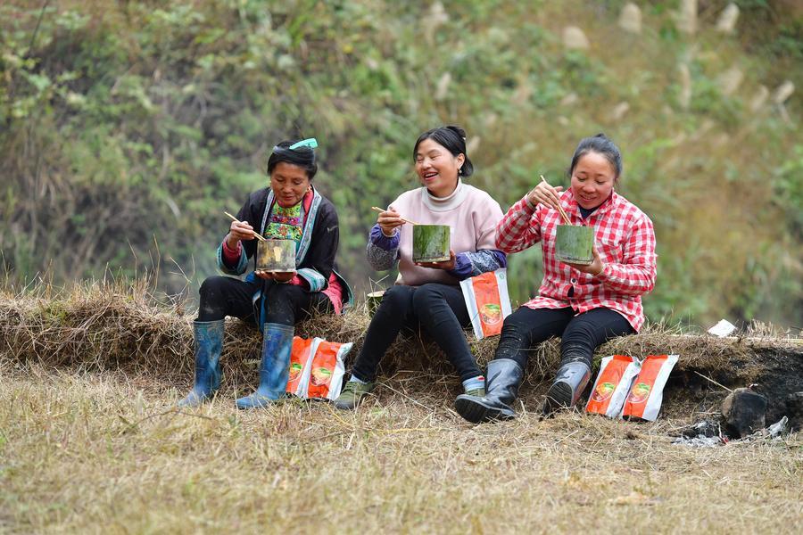 柳州市融水ミャオ族自治県党鳩村の畑のそばで、タニシビーフンを食べる人たち。(2021年12月10日撮影、柳州=新華社記者/黄孝邦)