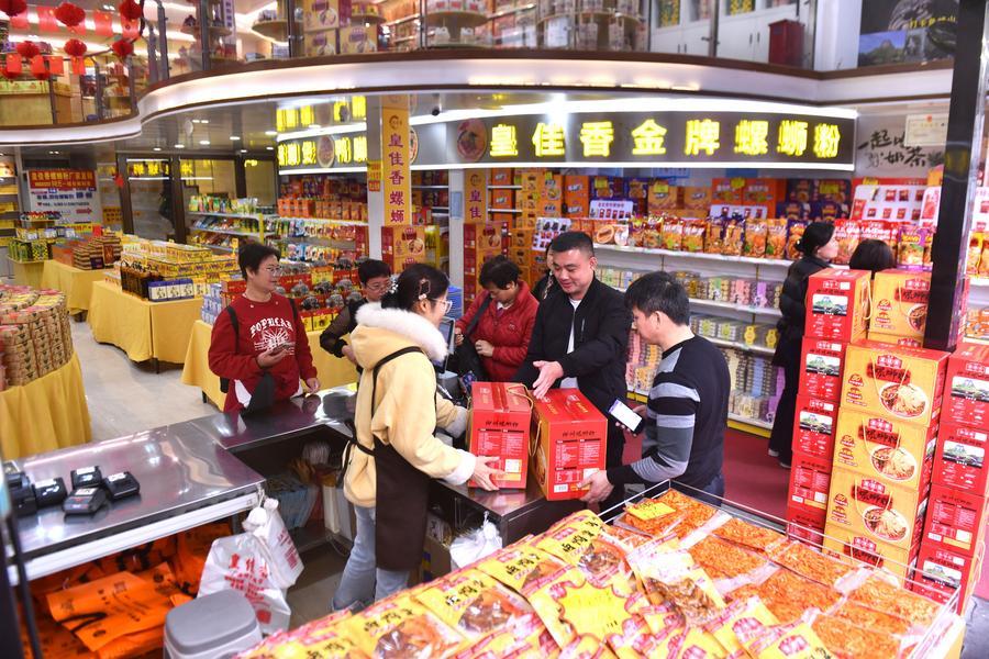 柳州市青雲民生市場のスーパーで、タニシビーフンを買い求める人たち。(3月10日撮影、柳州=新華社記者/黄孝邦)