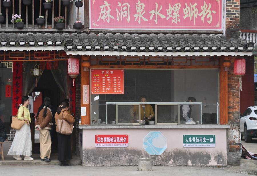 柳州市融水鎮新国村のタニシビーフン店で列を作る人たち。(3月7日撮影、柳州=新華社記者/黄孝邦)