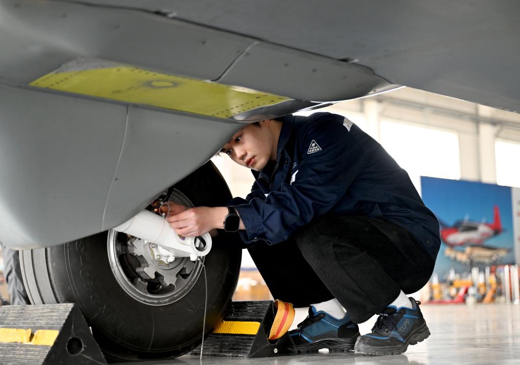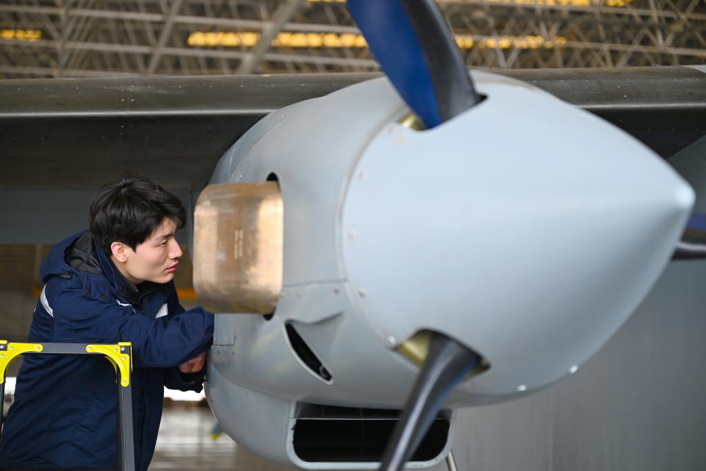 30日、鄭州上街空港で、試験飛行前に「長鷹-8」のエンジンを点検するスタッフ。(鄭州=新華社記者/郝源)