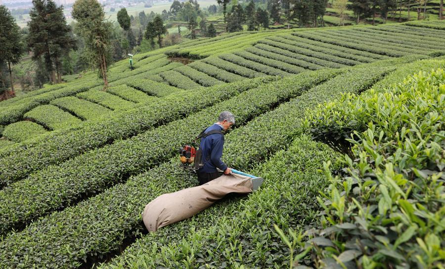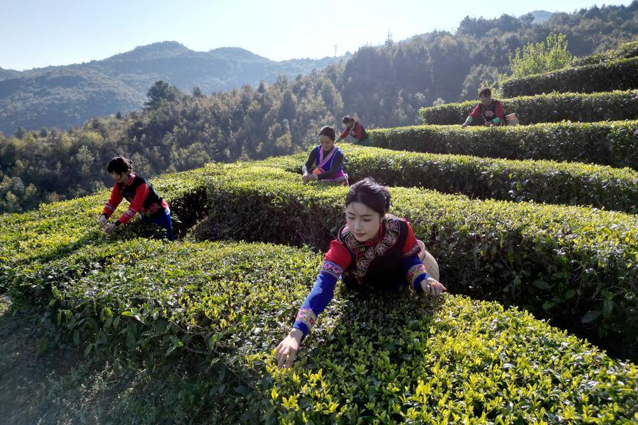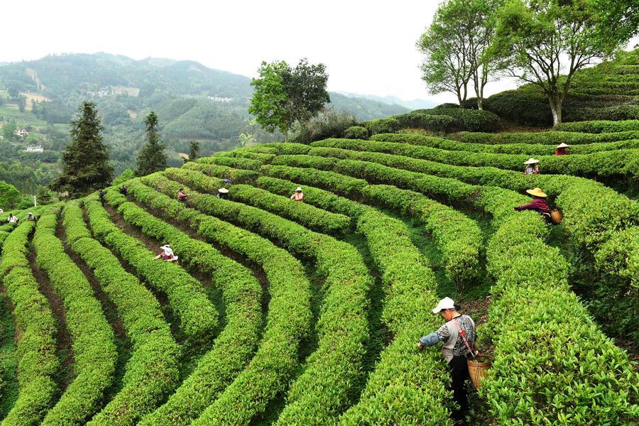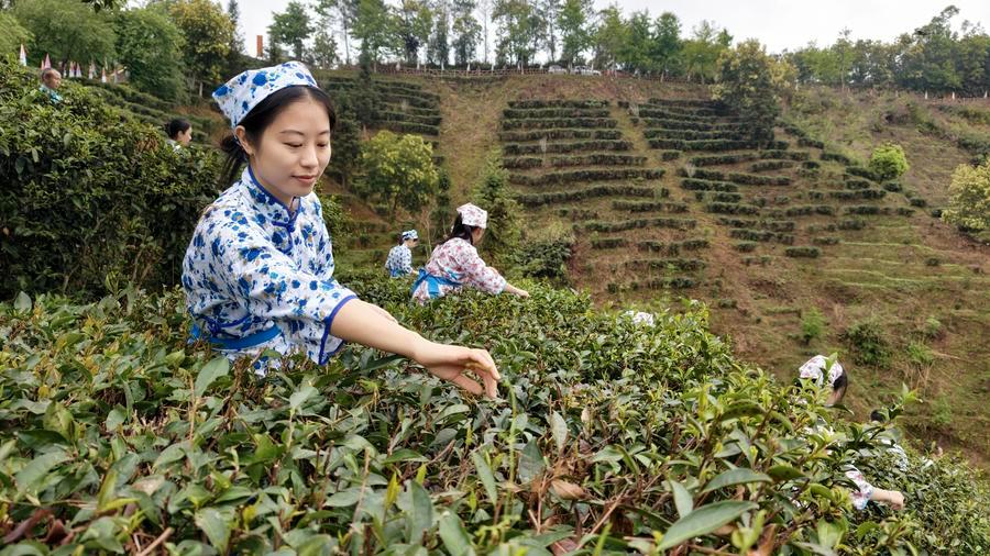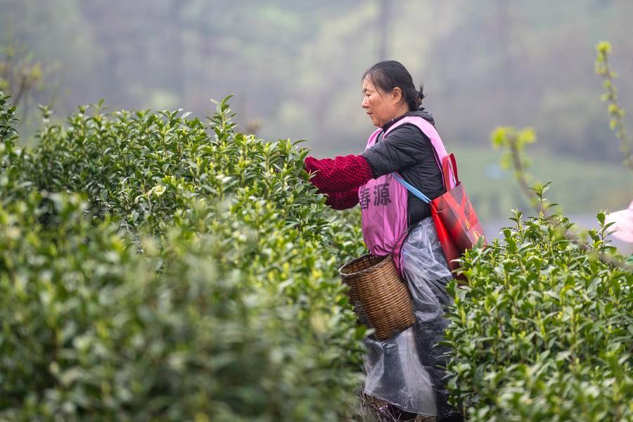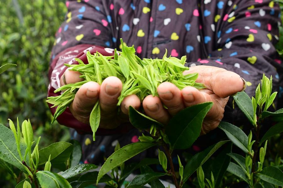 27日、四川省眉山市洪雅県の青杠坪村にある茶園で「明前茶」の茶葉を摘む農家の人。(眉山=新華社配信/姚永亮)