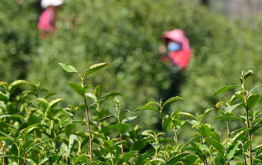 28日、湖北省宜昌市秭帰(しき)県長嶺村の茶畑で茶葉を摘む農家の人。(宜昌=新華社配信/王輝富)