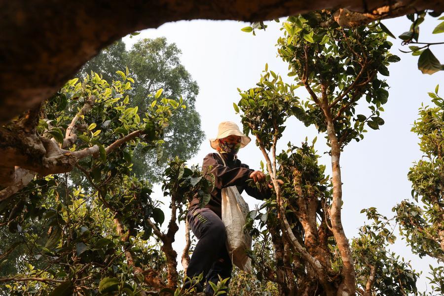 28日、雲南省勐海(もうかい)県賀開村で「明前茶」の茶葉を摘む農家の人。(勐海=新華社配信/李雲生)