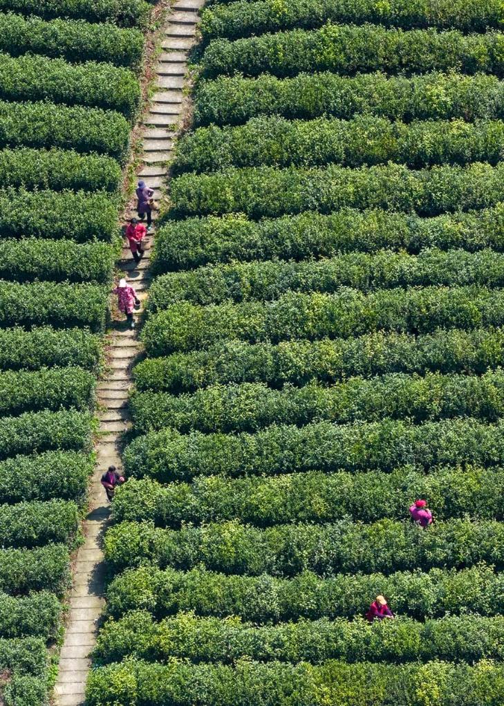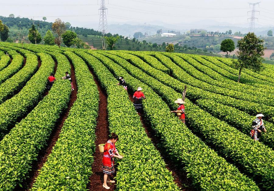 27日、雲南省大理ぺー族自治州南澗イ族自治県の鳳凰山に広がる茶畑で「明前茶」の茶葉を摘む農家の人。(ドローンから、南澗=新華社配信/適志宏)