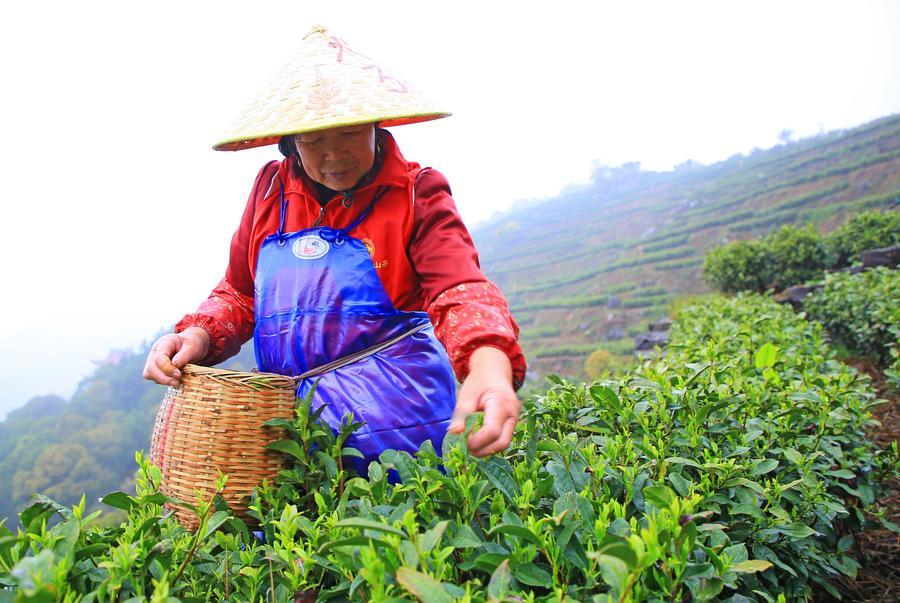 29日、浙江省玉環市大麦嶼街道の石峰山火山茶基地で「明前茶」の茶葉を摘む農家の人。(玉環=新華社配信/段俊利)