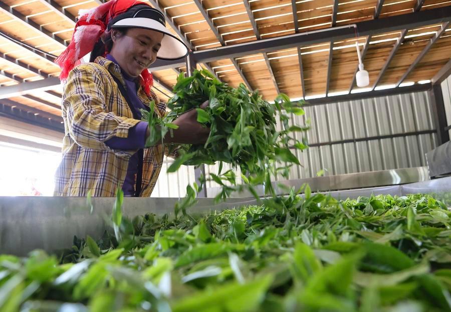 28日、雲南省勐海県賀開村で茶葉を天日干しする農家の人。(勐海=新華社配信/李雲生)