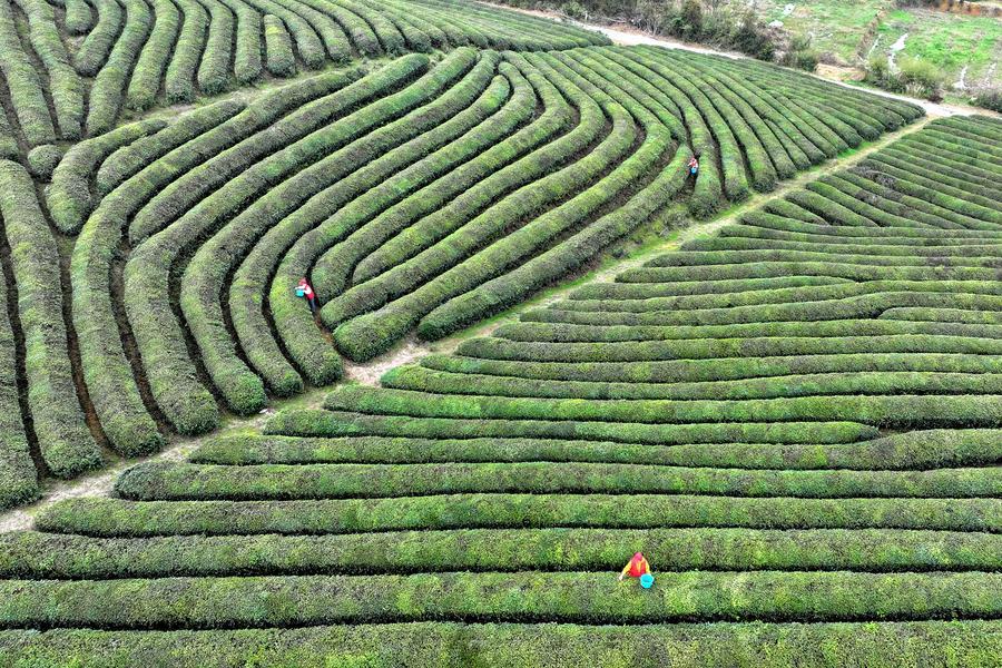 27日、湖北省咸寧市通城県油坊村の錦山基地の茶畑で「明前茶」の茶葉を摘む農家の人。(ドローンから、咸寧=新華社配信/劉建平)