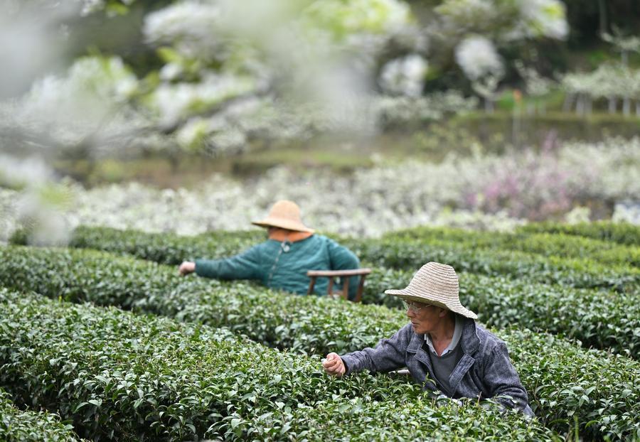 【新華社北京3月31日】中国各地の茶園で茶葉の収穫が最盛期を迎えている。二十四節気の清明(今年は4月5日)前に摘んだ新芽で作るお茶は「明前茶」と呼ばれ、貴重で最上級品とされる。農家の人々は摘み取りに精を出し、市場への供給を確保している。