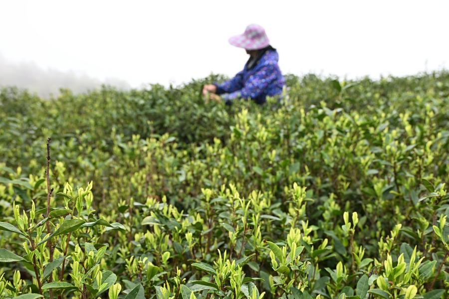 28日、広西チワン族自治区梧州市蒼梧県六堡鎮の哈口茶園で「明前茶」の茶葉を摘む農家の人。(梧州=新華社配信/廖祖平)