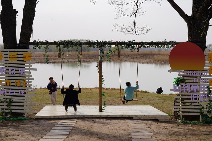 25日、漳沢湖国家都市湿地公園でブランコに乗る人たち。(長治=新華社記者/陳志豪)