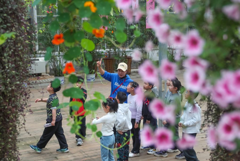 1日、子どもたちに植物に関する知識を説明する江蘇農博園の職員。(句容=新華社記者/季春鵬)