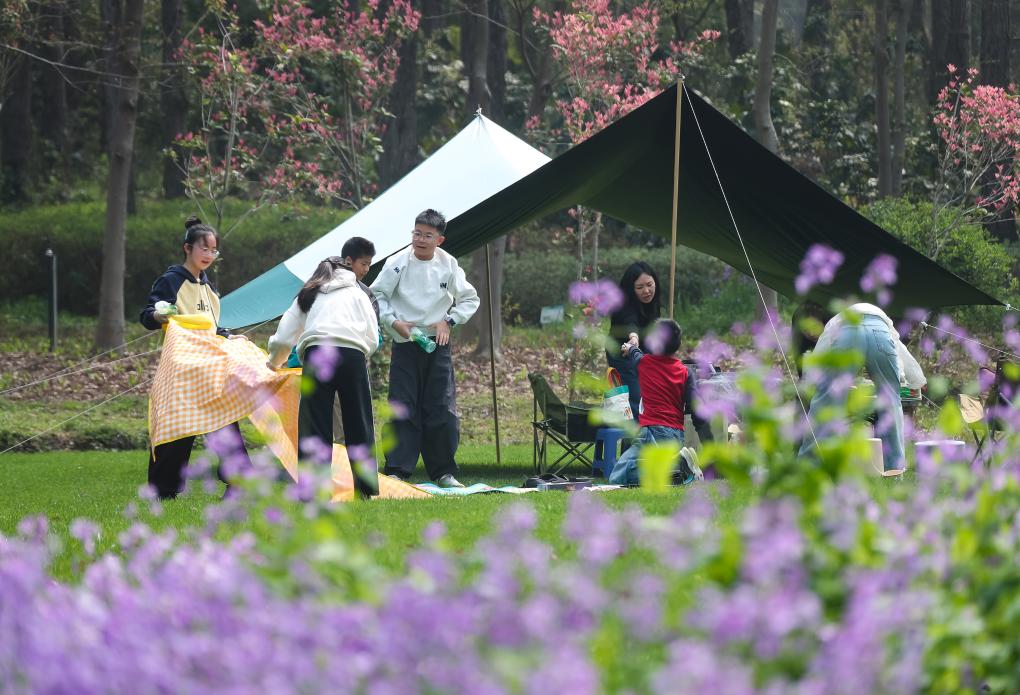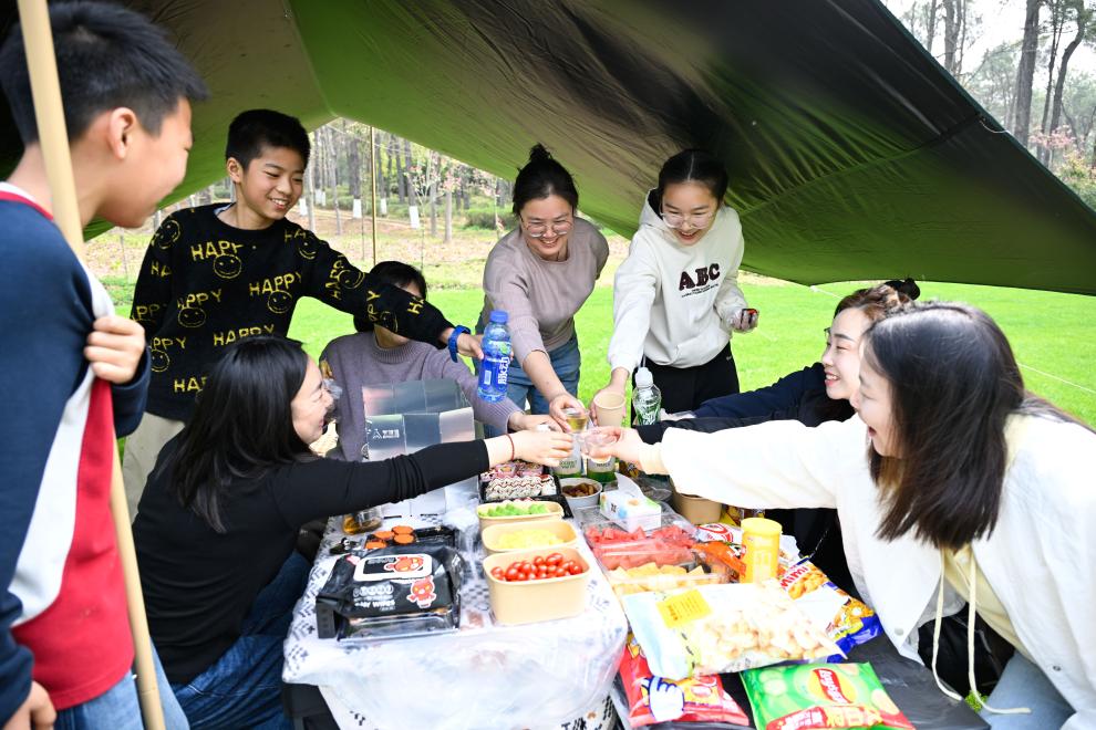 1日、江蘇農博園で家族とキャンプをする小学生。(句容=新華社記者/季春鵬)