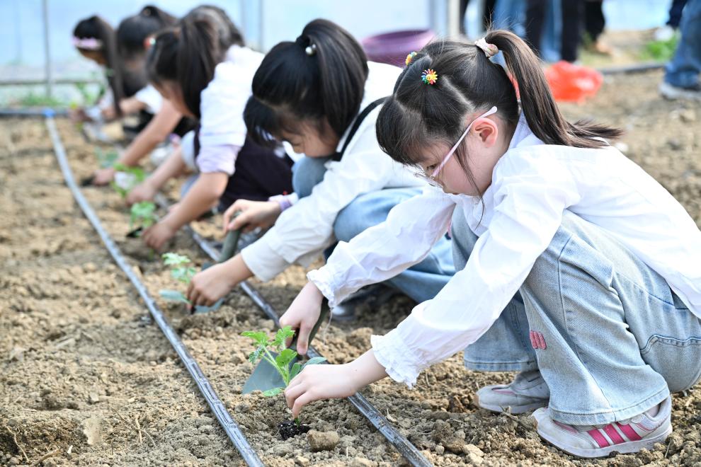 1日、江蘇農博園でスイカの苗を植える子どもたち。(句容=新華社記者/季春鵬)