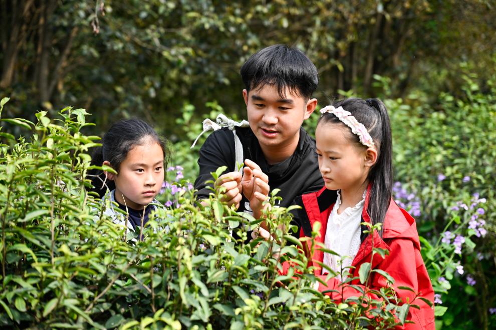 1日、子どもたちに茶摘みの仕方を説明する江蘇農博園の職員。(句容=新華社記者/季春鵬)