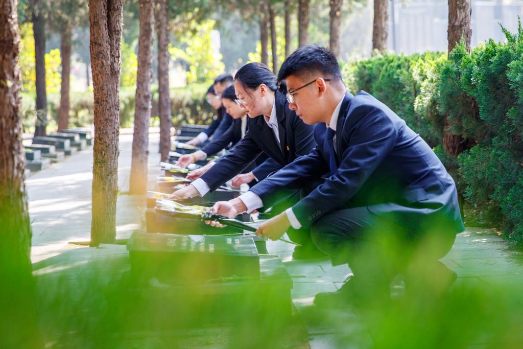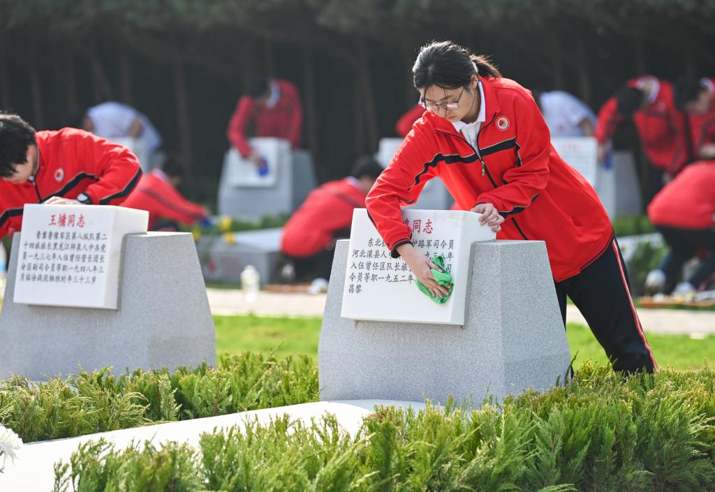 2日、河北省石家荘市の華北軍区烈士陵園で、烈士の墓を清掃する生徒。(石家荘=新華社配信/張暁峰)