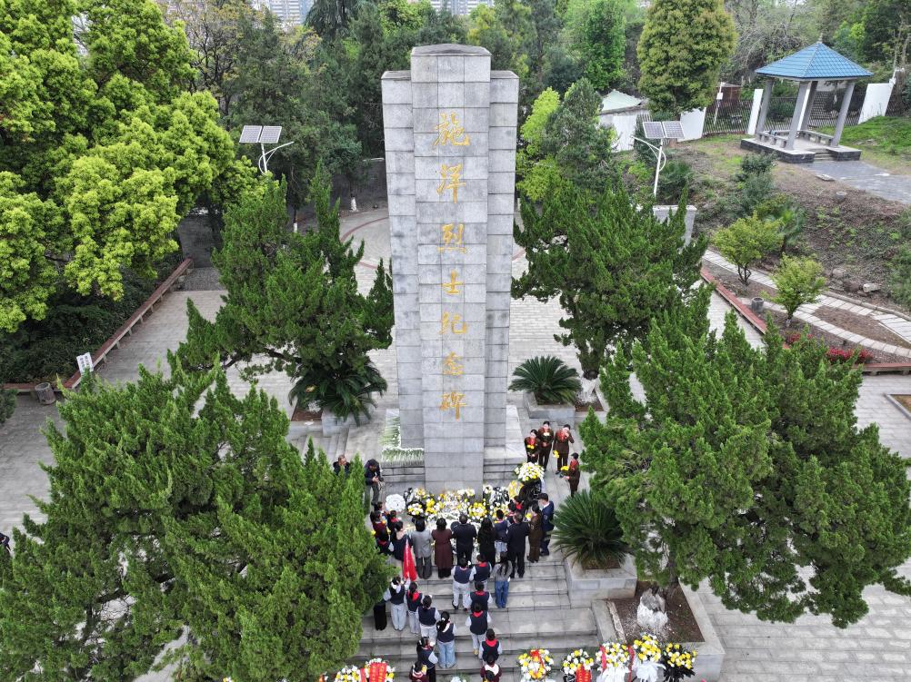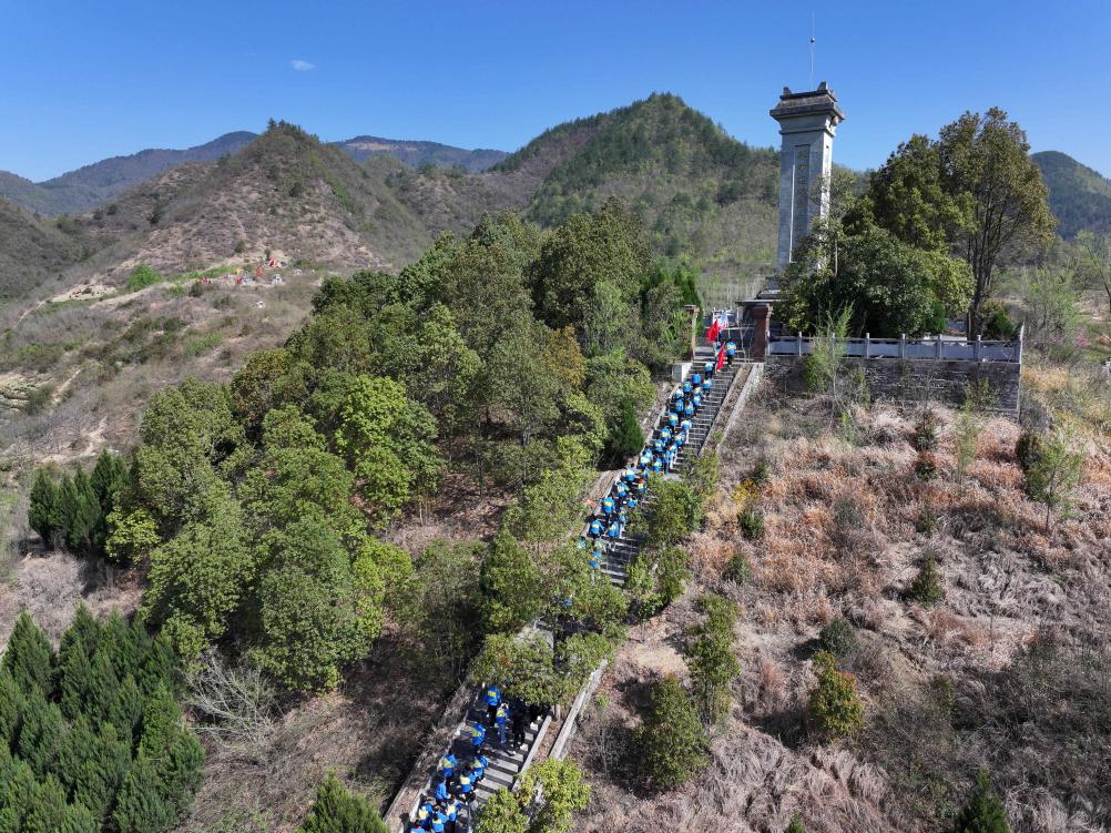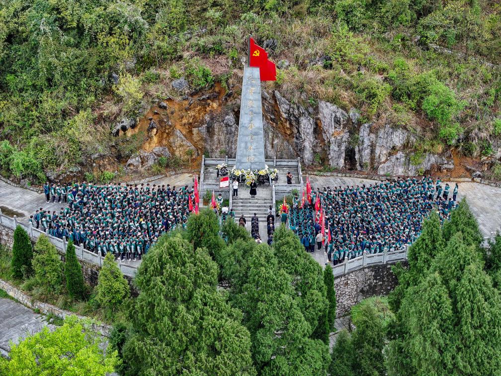 3月31日、貴州省遵義市播州区の茶山関烈士陵園で烈士を追悼する尚嵇中学校の教師や生徒。(ドローンから、遵義=新華社配信/袁福洪)