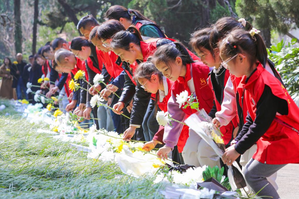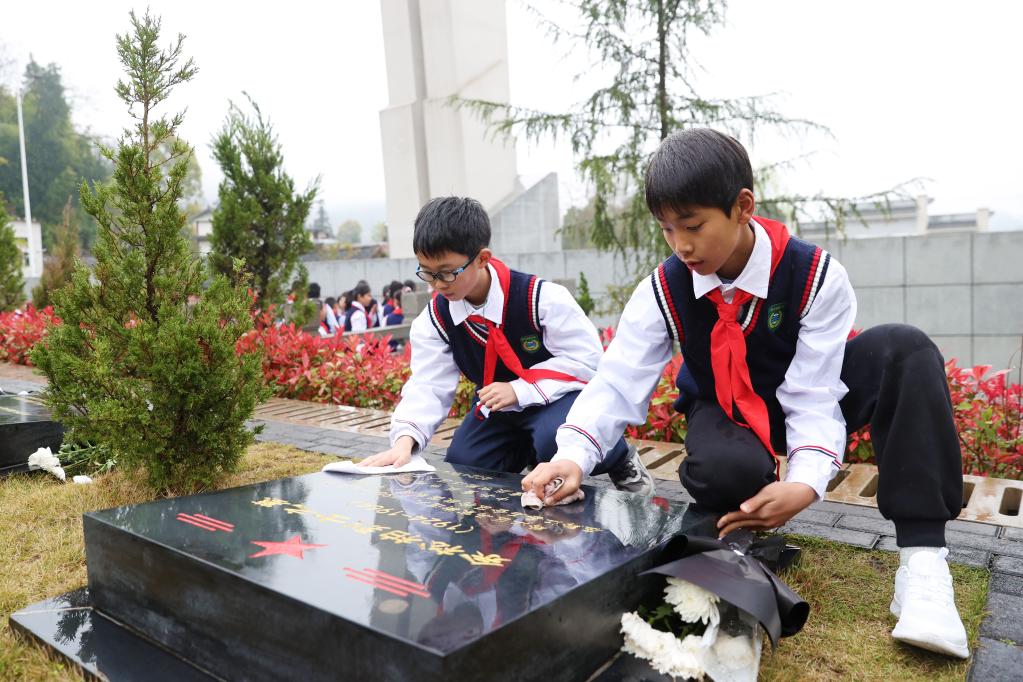 1日、湖南省懐化市通道トン族自治県の烈士陵園で、烈士を追悼する地元小学校の教師と児童。(懐化=新華社配信/粟勇主)