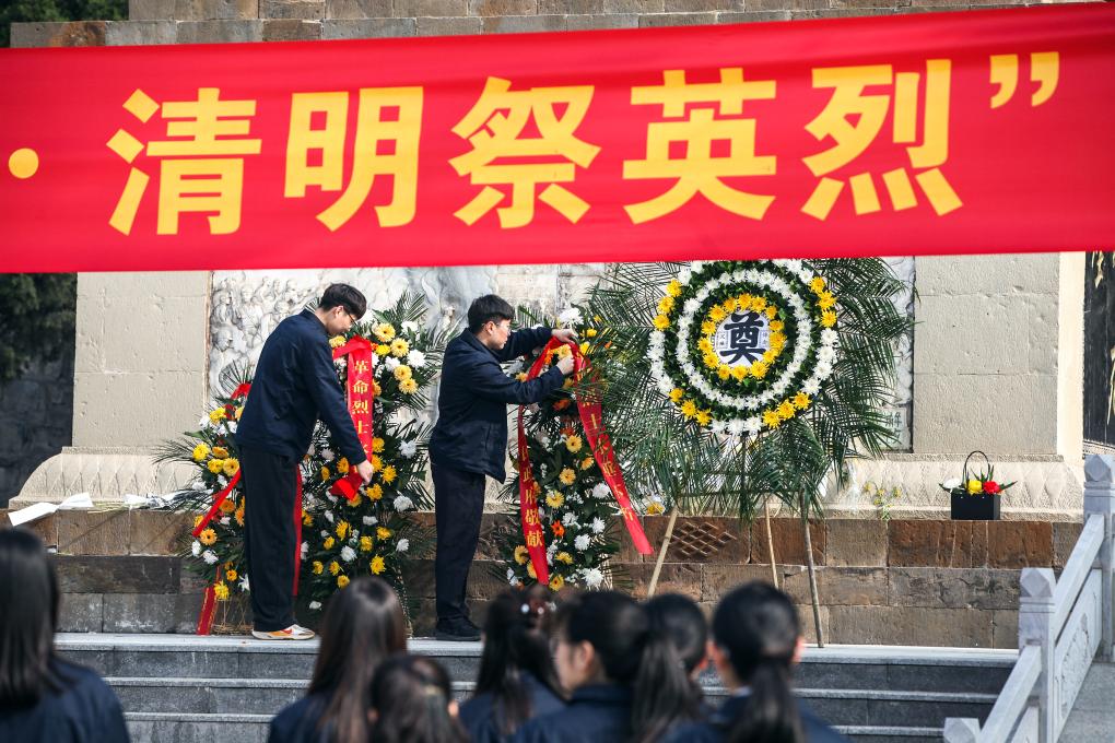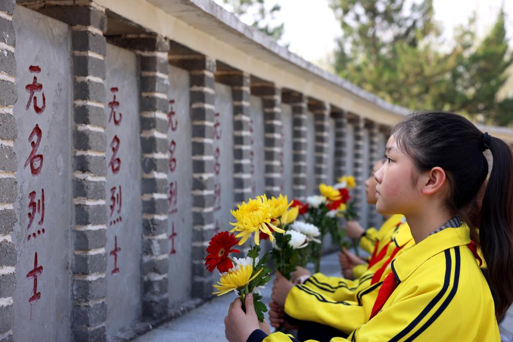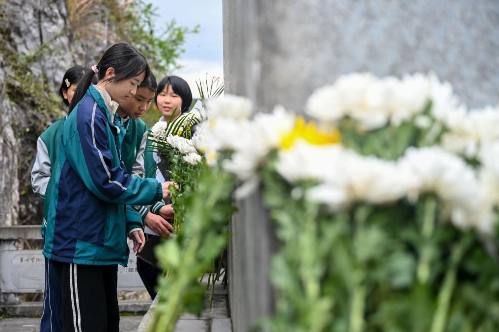 3月31日、貴州省遵義市播州区の茶関山烈士陵園で献花する尚嵇中学校の生徒。(遵義=新華社配信/袁福洪)