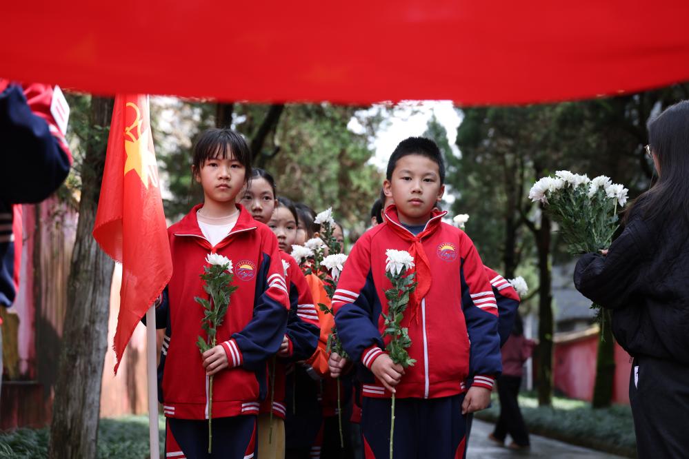 1日、湖北省襄陽市保康県歇馬鎮の烈士陵園で、烈士をしのぶテーマ教育活動に参加する地元の小学生。(襄陽=新華社配信/楊韜)