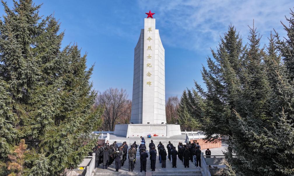 1日、黒竜江省綏芬河(すいふんが)市の革命烈士紀念碑前で、烈士を追悼する各界の青年代表。(ドローンから、綏芬河=新華社配信/曲芸偉)