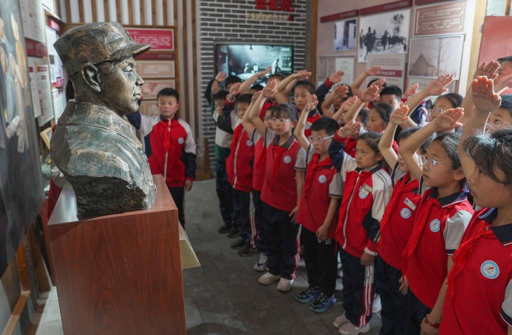 2日、河南省駐馬店市の楊靖宇将軍紀念館で行われた烈士を追悼する活動。(駐馬店=新華社配信/弓華静)
