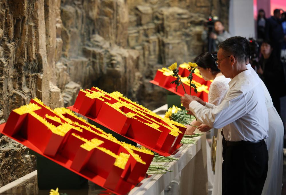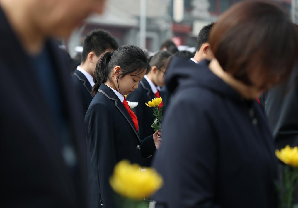3日、清明節に合わせた教育活動の始動式で、烈士を追悼する社会各界の代表。(北京=新華社記者/張晨霖)