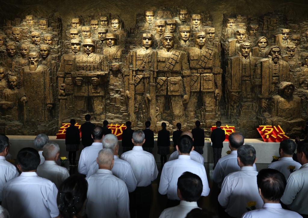3日、中国人民抗日戦争紀念館で、烈士に献花する社会各界の代表。(北京=新華社記者/張晨霖)