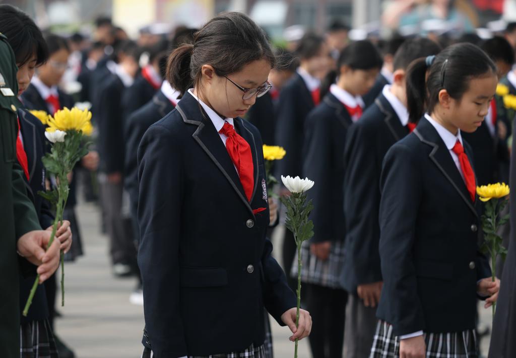 3日、清明節に合わせた教育活動の始動式で、烈士を追悼する生徒代表。(北京=新華社記者/張晨霖)