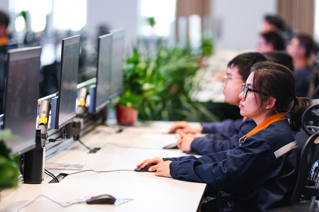 3月31日、包頭鋁業の集中制御室で生産状況を監視する従業員。(包頭=新華社配信/康文魁)