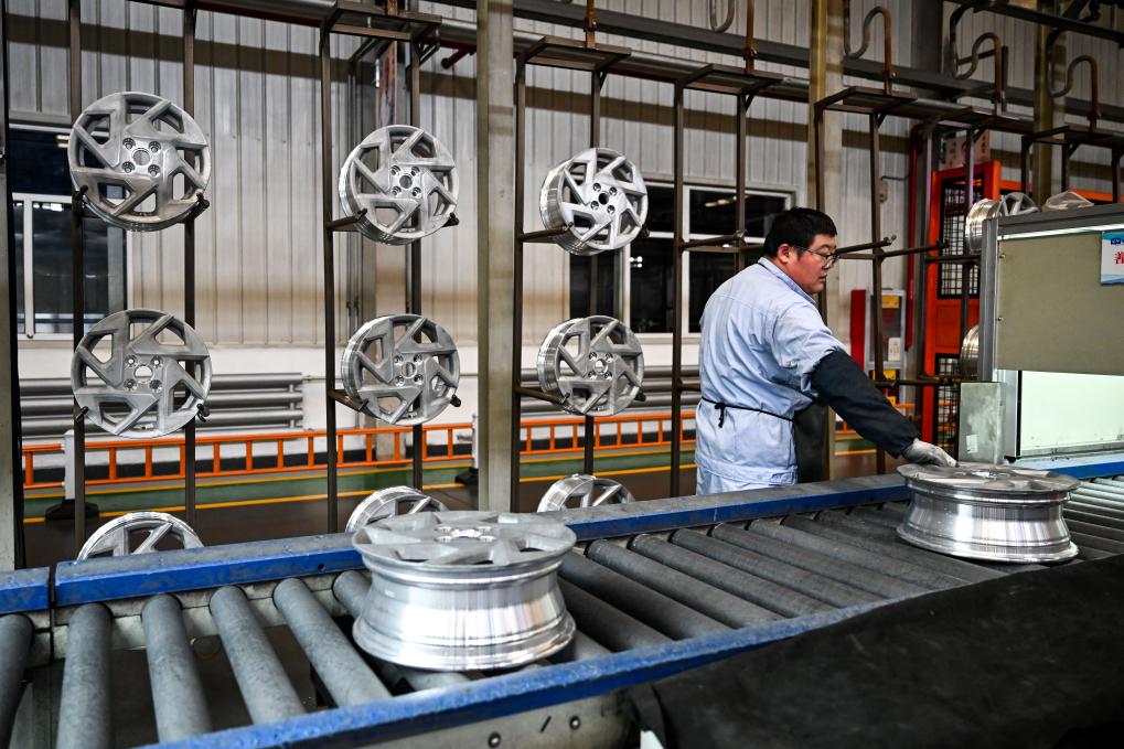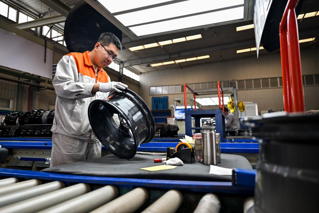 1日、自動車部品メーカー、包頭盛泰汽車零部件製造のアルミ合金ホイール生産ラインで働く従業員。(包頭=新華社記者/李志鵬)