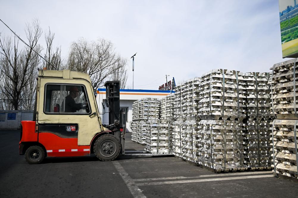1日、包頭鋁業でフォークリフトを使ってアルミインゴットを搬送する従業員。(包頭=新華社記者/李志鵬)