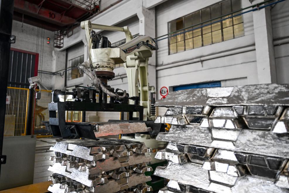 1日、包頭鋁業のアルミ鋳物生産ラインで、アルミインゴットを運ぶロボットアーム。(包頭=新華社記者/李志鵬)
