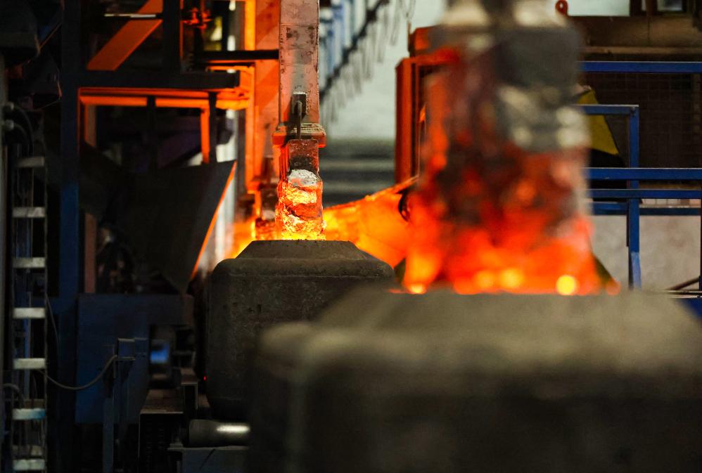 1日、包頭鋁業のアルミ鋳物生産ラインで働く従業員。(包頭=新華社記者/李志鵬)