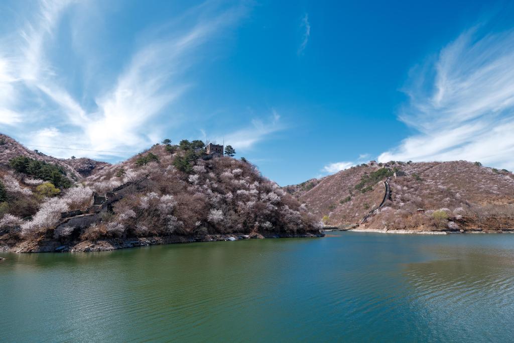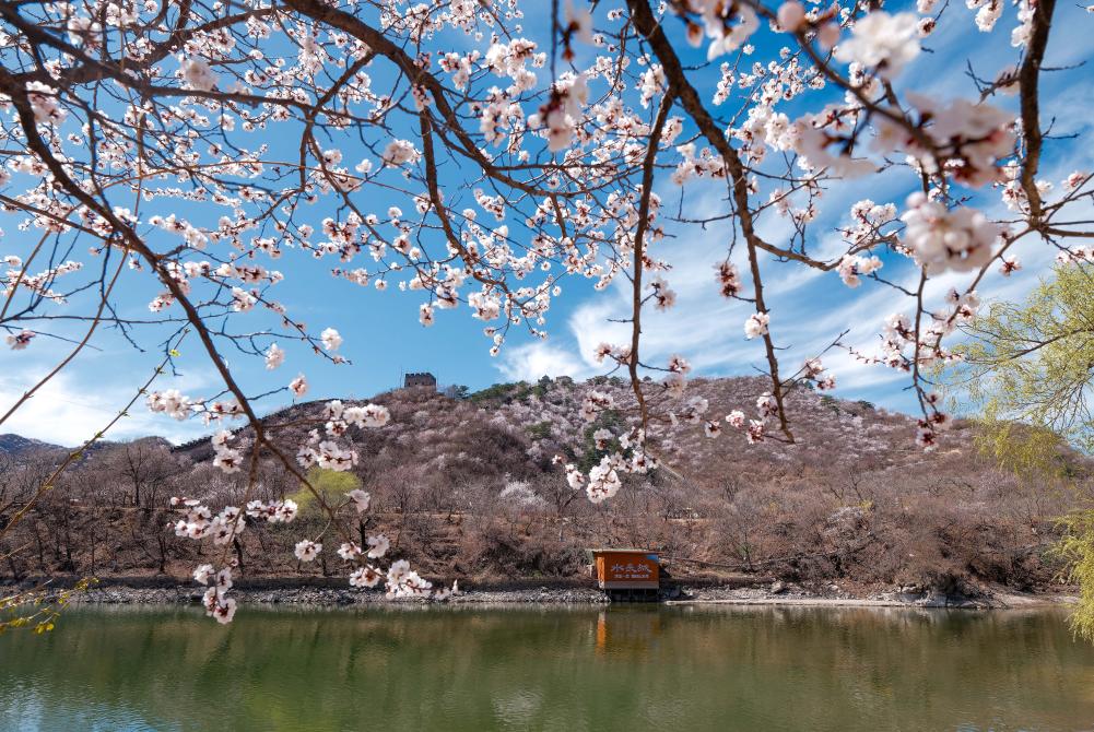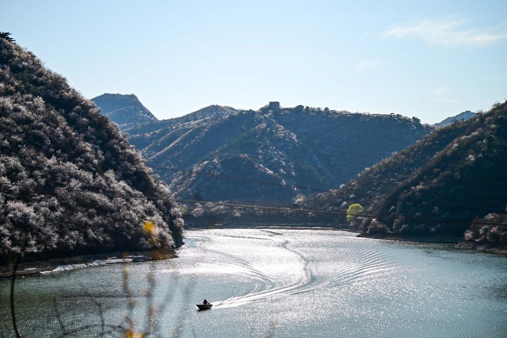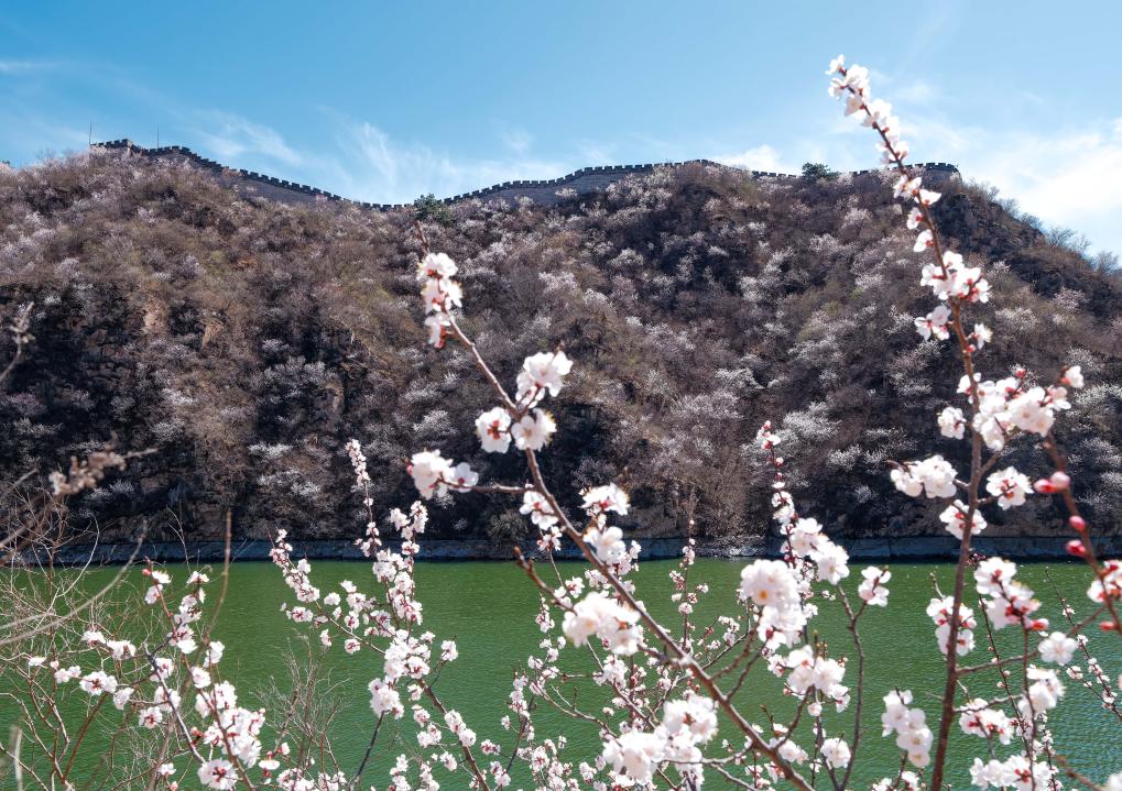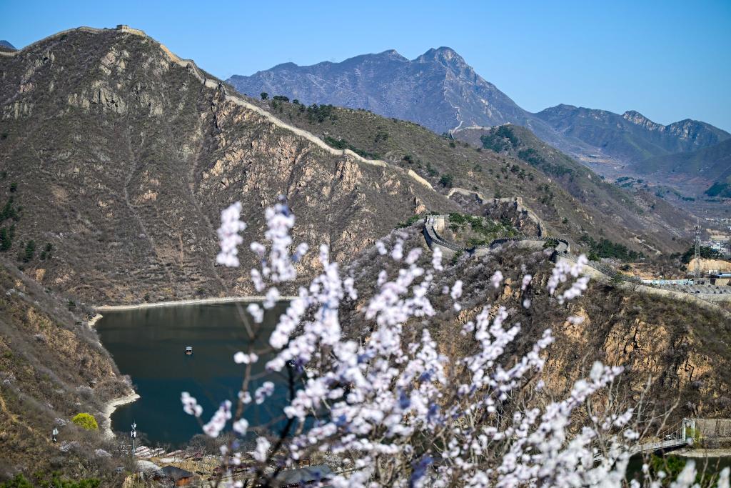 【新華社北京4月3日】中国北京市懐柔区にある黄花城水長城では、湖と一体となった長城の景観に山花が彩りを添え、春の風景が広がっている。