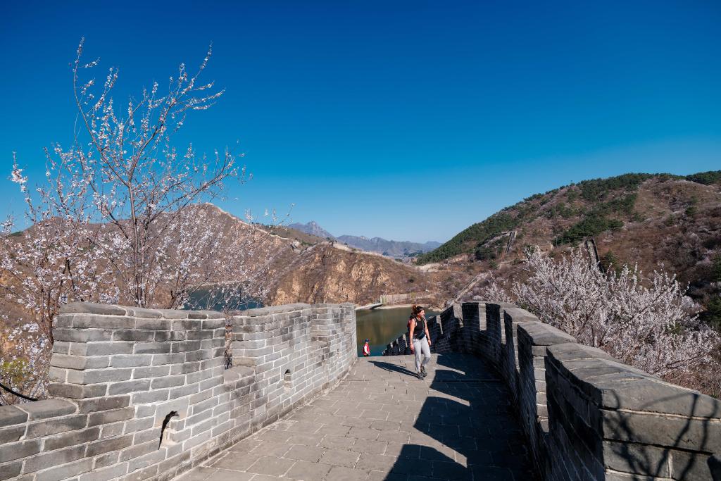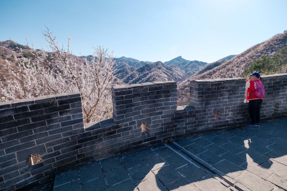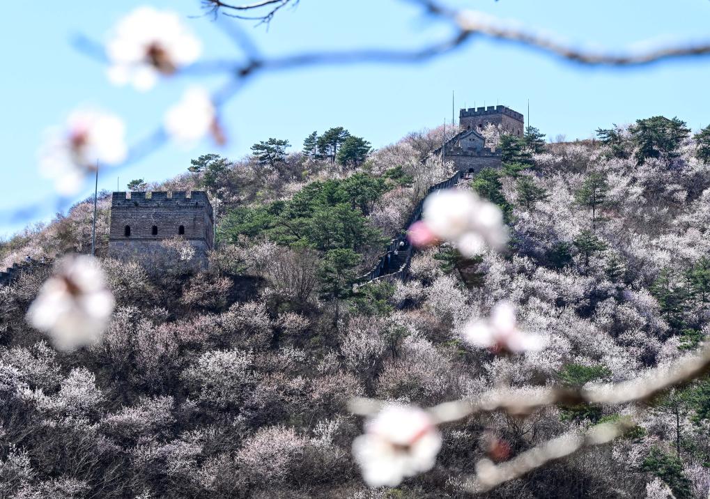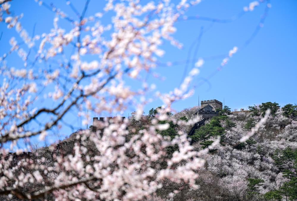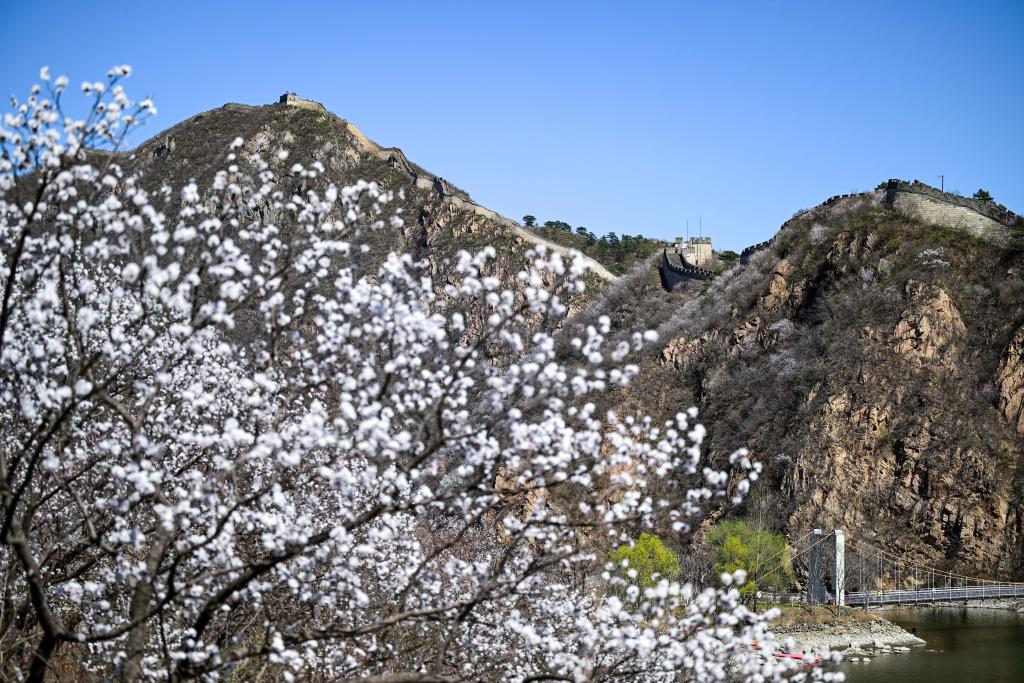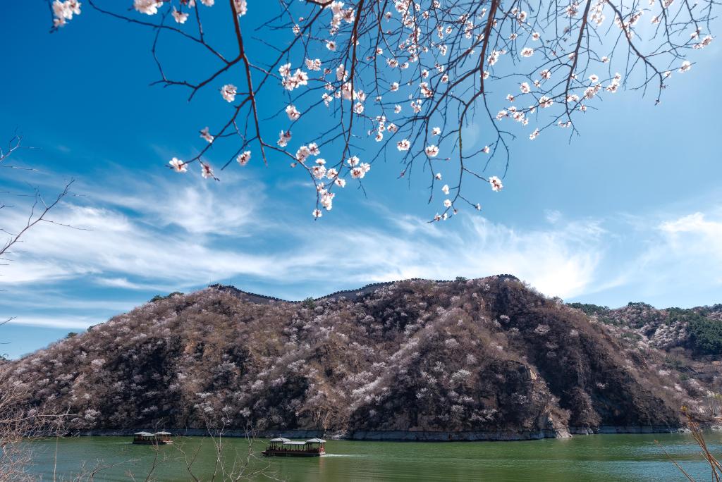 【新華社北京4月3日】中国北京市懐柔区にある黄花城水長城では、湖と一体となった長城の景観に山花が彩りを添え、春の風景が広がっている。