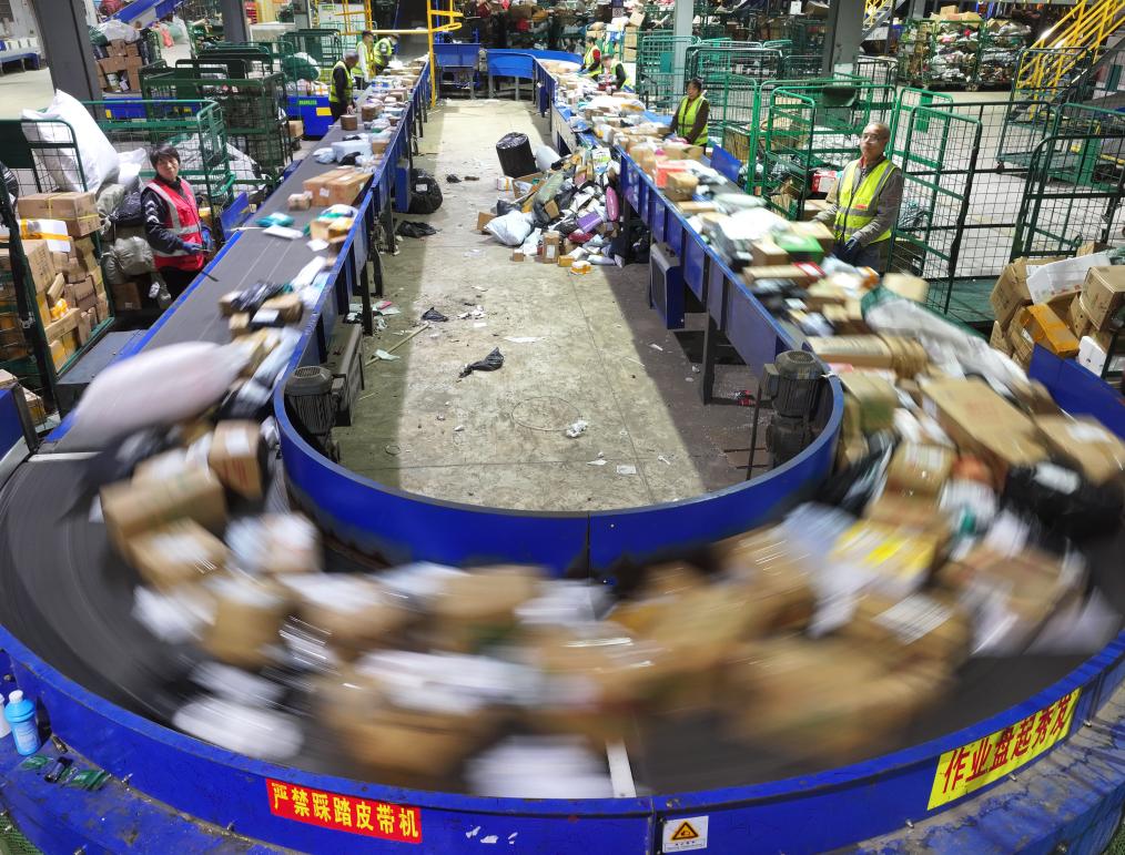 中国郵政集団湖南省衡陽市センター郵便局の郵便処理センターで、荷物を仕分ける職員。(2025年11月5日、ドローンから、衡陽=新華社配信/曹正平)