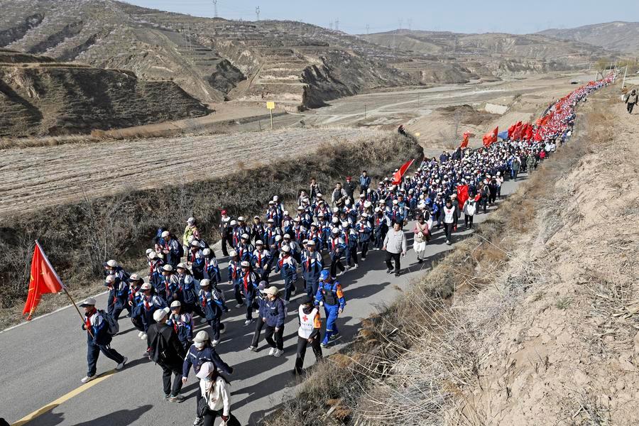 3日、任山河烈士陵園を目指して歩く教師と生徒ら。(固原=新華社記者/王鵬)
