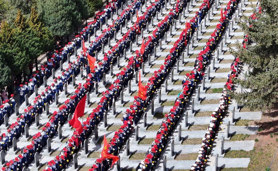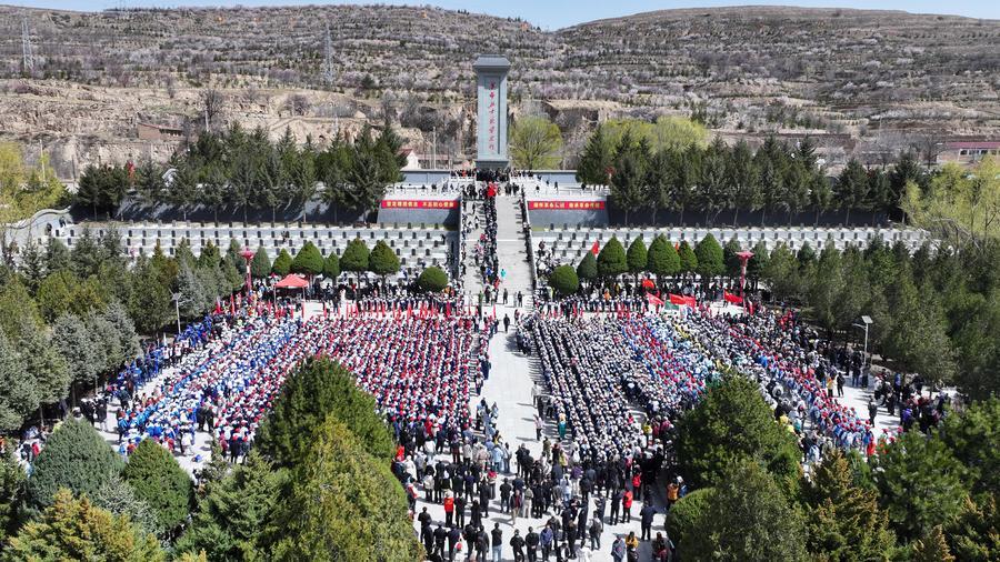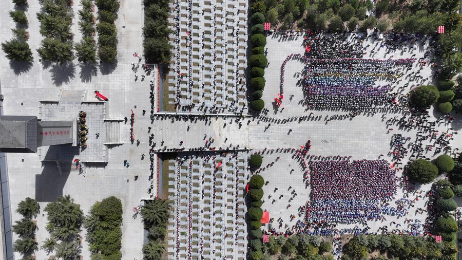 3日、任山河烈士陵園で烈士をしのぶ教師や生徒、各界の関係者ら。(ドローンから、固原=新華社記者/王鵬)
