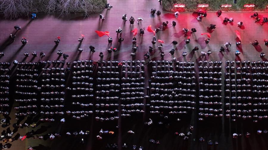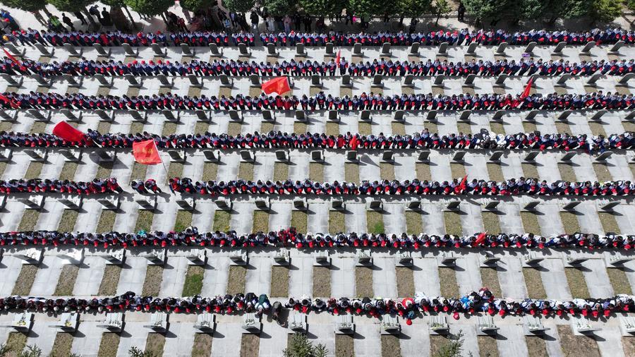3日、任山河烈士陵園で追悼活動に参加した教師や生徒、各界の関係者ら。(ドローンから、固原=新華社記者/王鵬)
