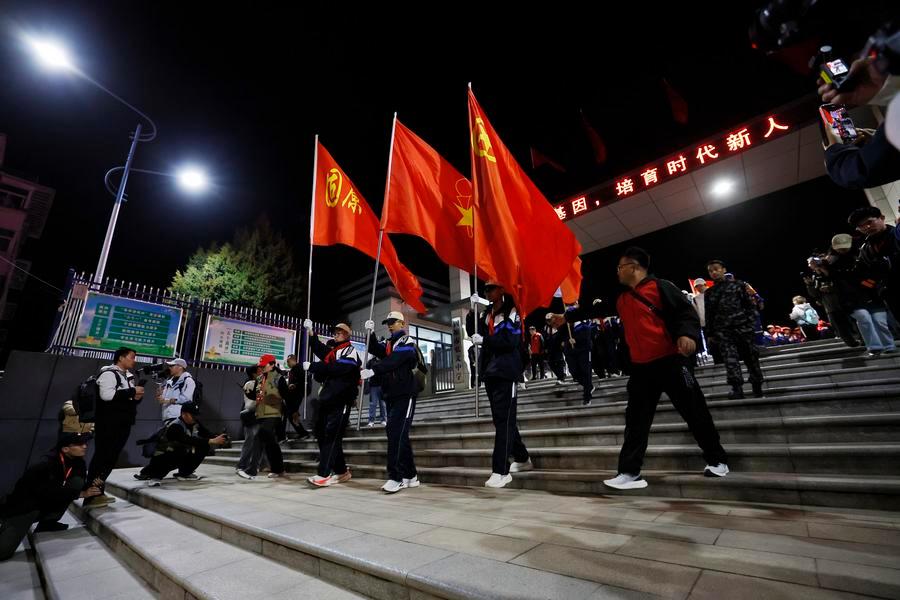 3日早朝、固原市弘文中学を出発する生徒ら。(固原=新華社記者/王鵬)