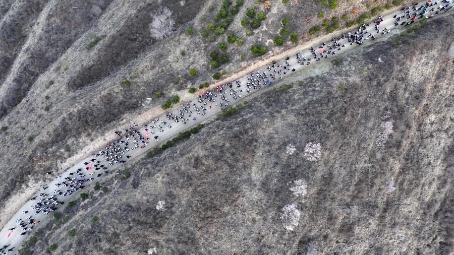 3日、黄茆山を越える教師と生徒ら。(ドローンから、固原=新華社記者/王鵬)