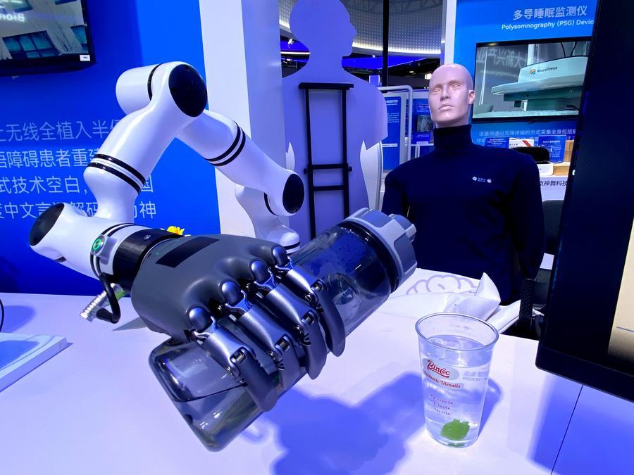 3月27日、中関村フォーラム年次総会の展示会場で、BCIシステム「北脳1号」の指令を受け、コップに水を注ぐロボットアーム。(北京=新華社記者/魏夢佳)