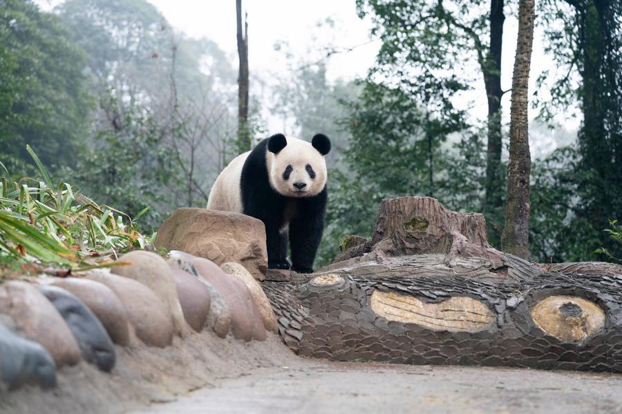 立ち止まったシャンシャン。(1月25日撮影、成都=新華社配信/Panda365提供)